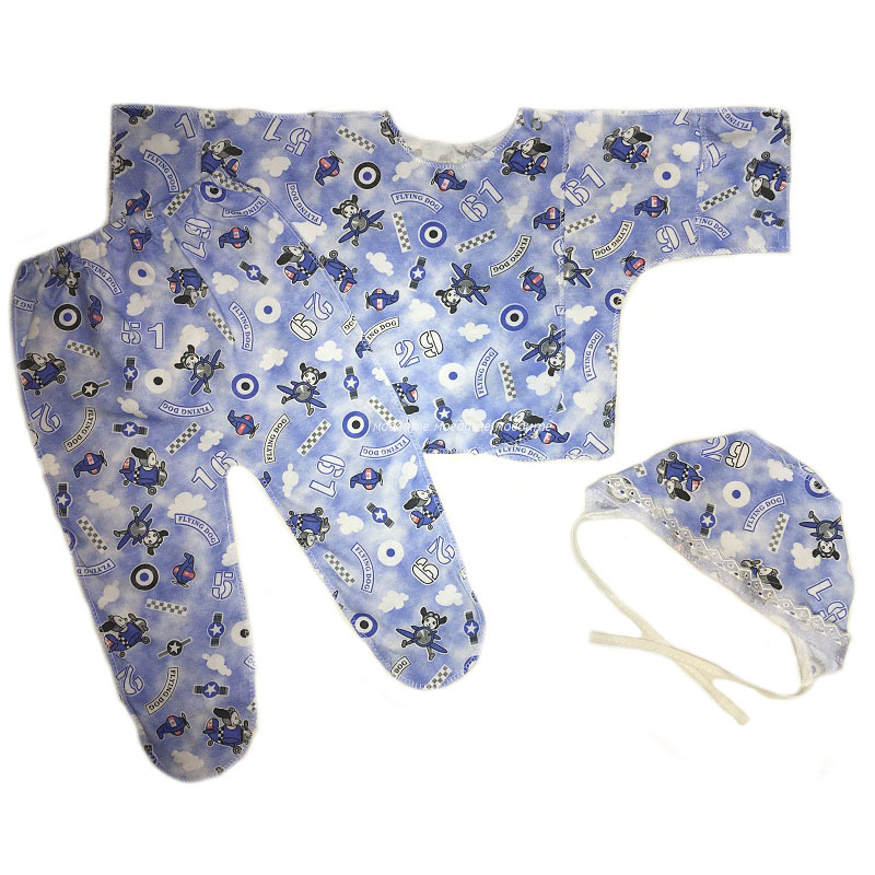 Комплект состоит из распашонки с рукавчиками трансформерами и с кнопочкой на одной стороне, ползунков на резинке, чепчика. Все швы у набора выполнены наружу. Рисунки в каждой партии отличаются.
